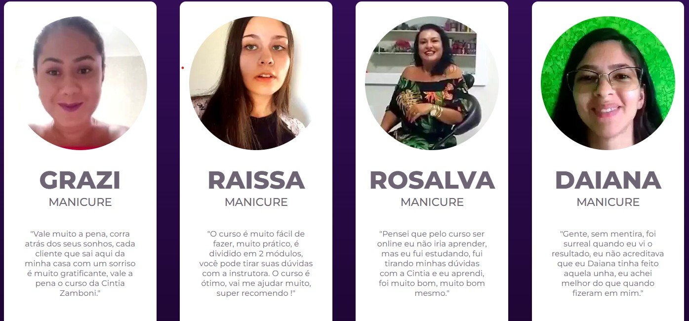 Pelo fato de ter um formato Simples, Prático e 100% Atualizado, faz com que as pessoas que adquiram o Curso de Unhas de Fibra Encapsuladas, acabem dando DEPOIMENTOS sobre a experiência que tiveram.